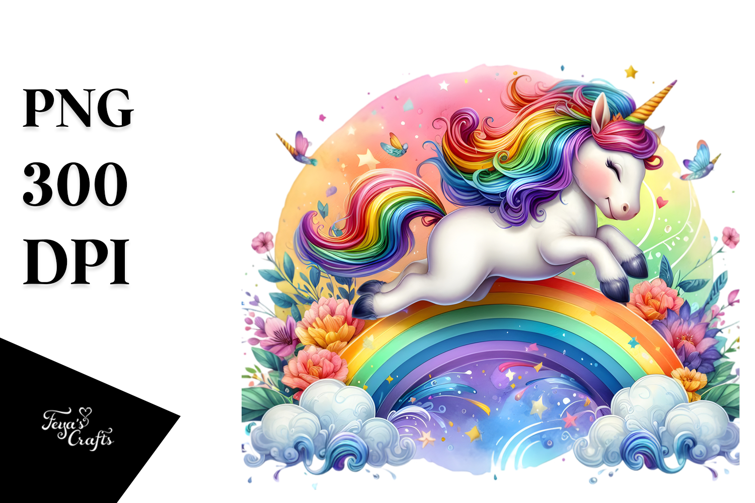colorful Baby Unicorn Sailing in Rainbow Sky example image 1