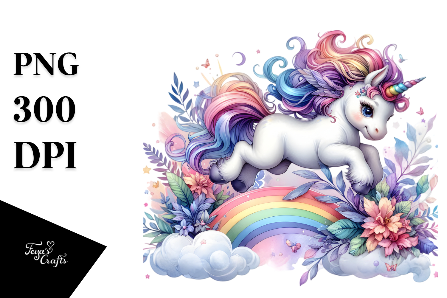 Colorful Unicorn Jumping over Rainbow PNG example image 1