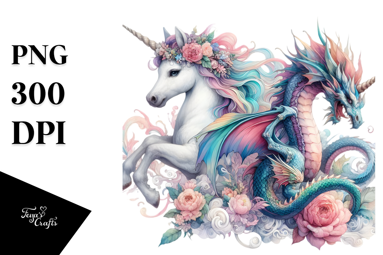 Baby Unicorn with Dragon, Watercolor PNG example image 1