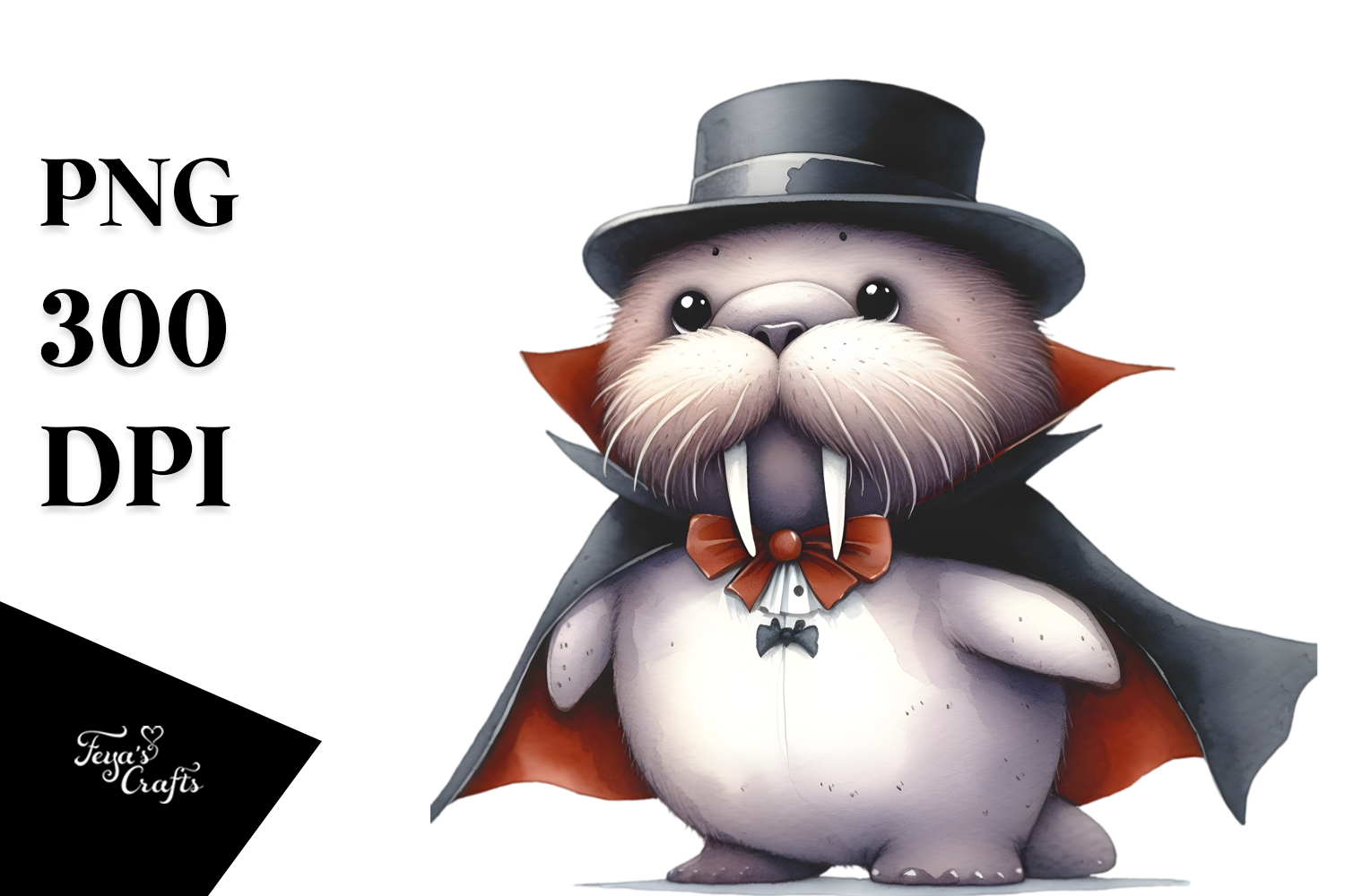 Vampire Walrus Whimsical Watercolor Clipart example image 1