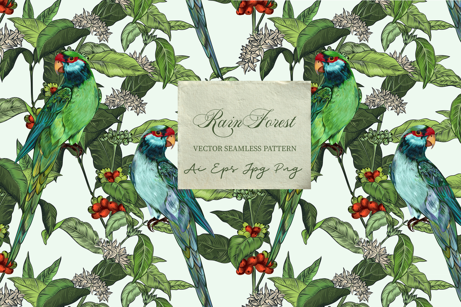 Introducing my new pattern parrot jungles - a delicately detailed floral print inspired by vintage aesthetics and designed with refined elegance in mind. This seamless design is ideal for textile applications, wedding stationery, packaging, and any creative project in need a timeless charm of botanical touch.
