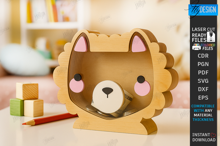 Personalized Piggy Bank Laser Cut | Animals Design | Money Box | Kids Design | 3D Silhouette | Shape of Animals | Wooden Box | Cute SVG | Lion | CNC File