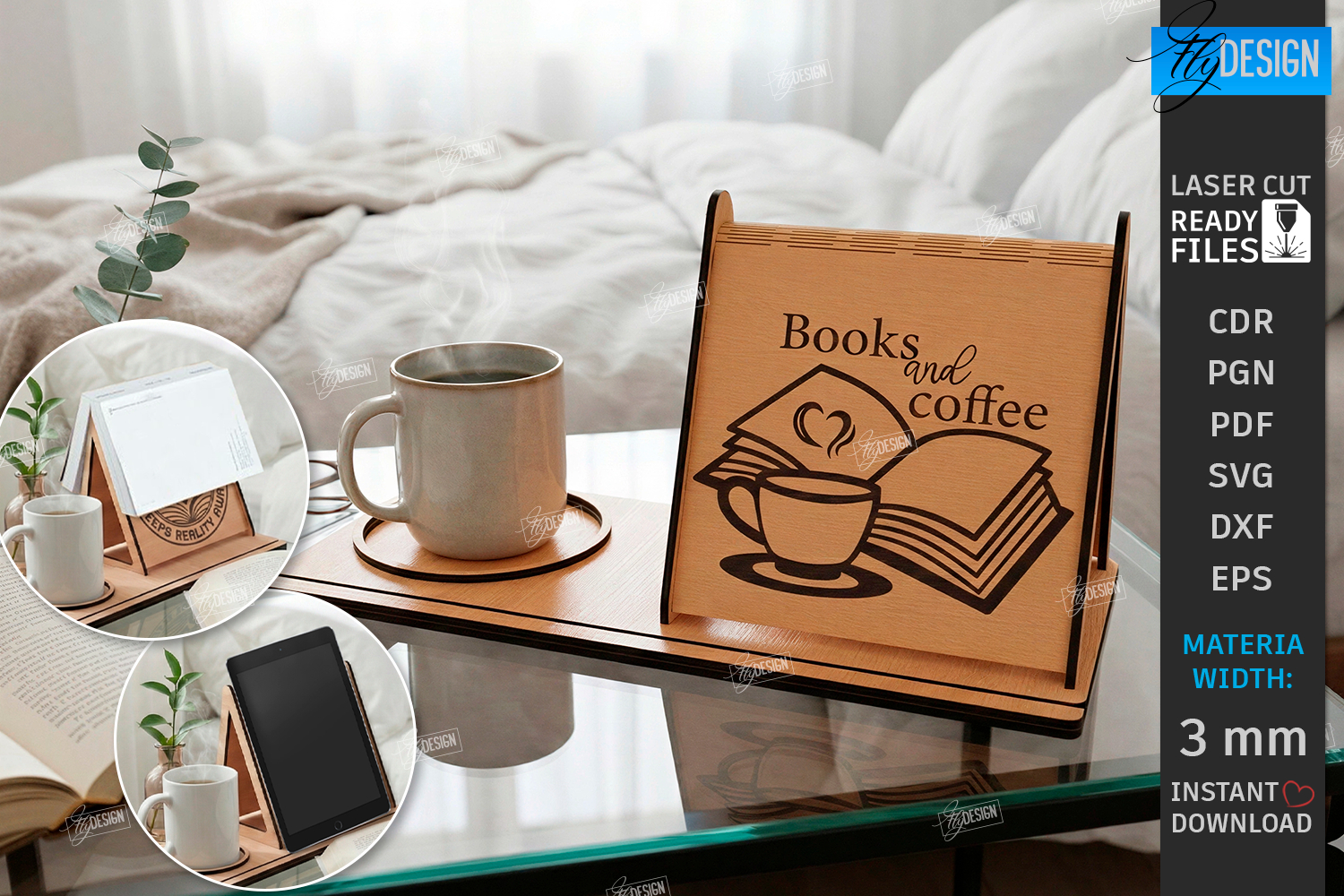 Wooden Book Stand Laser Cut | Mug Holder SVG | Book Lover | Reader’s Rest Tray | Personalized Book Stand for Bookworms | Desktop Book Display Stands with Coaster | CNC File