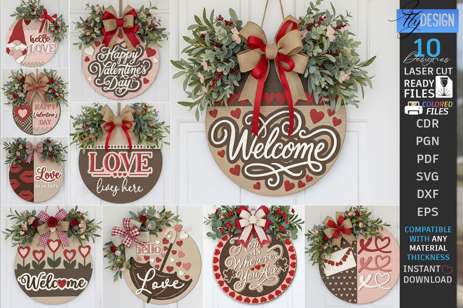 Valentine's Day Round Door Signs Laser Cut Bundle | Romantic Welcome Sign SVG | Happy Valentine's Day | Wall Decor | Home Decor | Sweet Hearts and Gnomes Glowforge Ready Designs | Wedding and Anniversary Gift Idea | Welcome Front Door Hanger Vector Templates | Floral and Heart Themed Laser Cutting Project | Digital Download | CNC Files