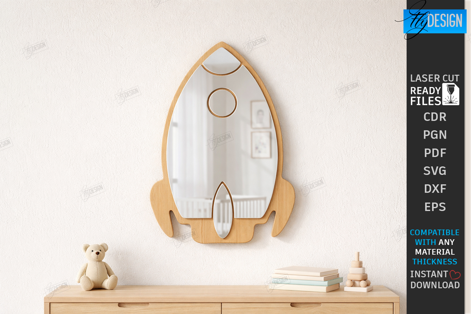 Kids Room Wall Mirror Laser Cut | Wall Decor | Nursery Acrylic Mirror SVG | Mirror Template for a Children's Room | Kids Laser | Children’s Mirror Frame SVG | Nursery Decor Laser File | Mirror Pattern Laser Ready | Nursery Wall Art SVG DXF | Interactive Kids Room Decor for Any Material Thickness | Home Decor | Rocket SVG | CNC File