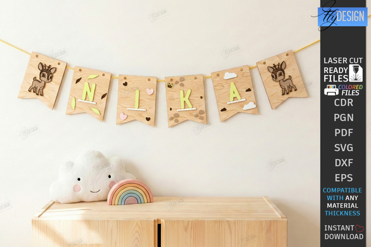 Baby Name Banner Laser Cut | Nursery Name Garland Designs | Personalized Kids Room Wall Decor SVG | Custom Alphabet Pennant Flag DXF | Safari Space | Boho Nursery Garland | Laser Ready Files for Glowforge | Wooden Name Sign Template | Kids Laser | Deer SVG | CNC File