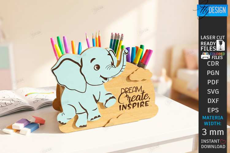 Desk Organizer Laser Cut | Kids Pencil Holder Designs | Classroom Decor and Stationery Storage DXF | Interactive Wooden Toy Template | 3mm Plywood Laser Ready Files | School Supplies Template | Nursery Decor | Elephant SVG | Glowforge Cut File