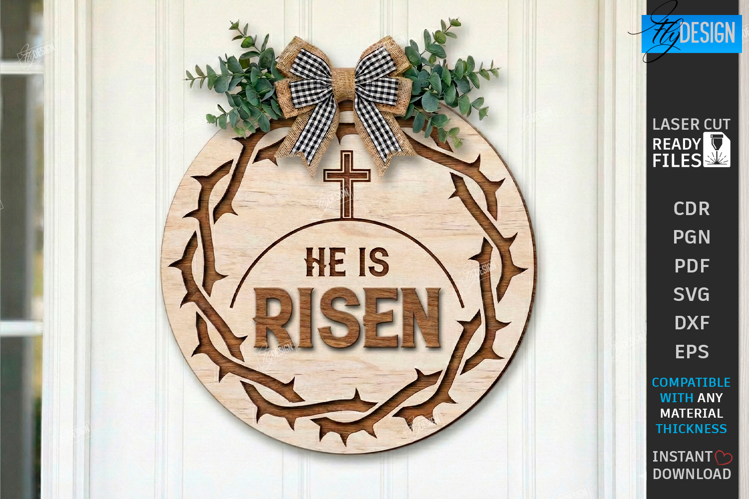 Wall Round Sign Laser Cut | He Is Risen | Easter Door Hanger | Christian Laser Cut Designs | Religious Round Sign for Glowforge | Jesus Resurrection Cross SVG | Easter Sunday Porch Decor Files | Scripture Wall Art DXF PDF | Faith Based Wood Sign Patterns