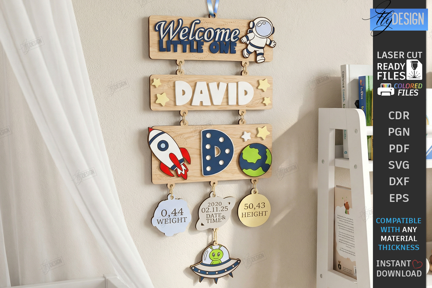 Baby Birth Announcement Sign Laser Cut | 3D Layered Newborn Name Plate Laser Cut File | Wall Decor | Personalized Nursery Wall Decor | Welcome Little One Birth Stats Sign DXF | Wall Sign | Custom Baby Shower Gift Patterns | Space Unicorn Bear Knight Mermaid Theme Laser File | Kids Room Door Sign Template | New Born SVG | Space SVG | CNC File