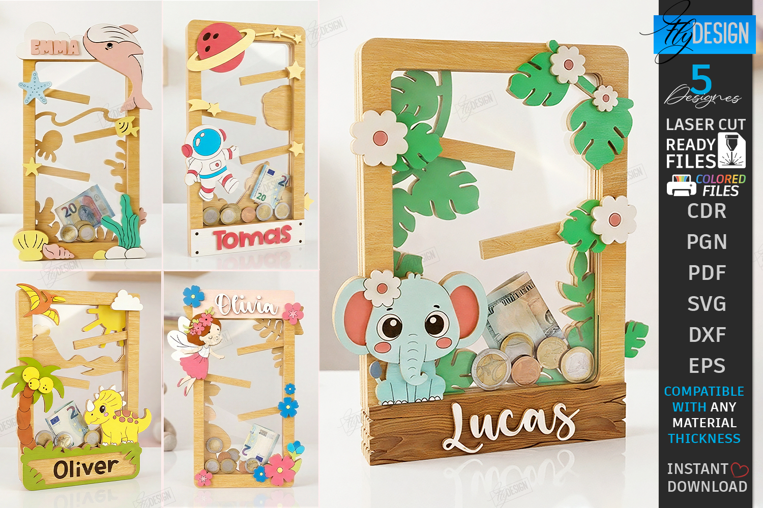 Personalized Wooden Coin Drop Bank Laser Cut Bundle | 5 3D Layered Money Box Laser Cut Files | Custom Name Piggy Bank DXF | Kids Design | Elephant Astronaut Dinosaur Dolphin Fairy Theme Bundle | Kids Room Decor Digital Download | Home Decor | Money Bank | Interactive Savings Jar for Glowforge | Nursery Gift Patterns | Kids Laser | CNC File