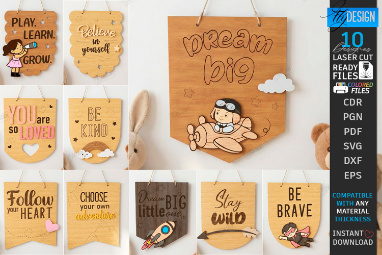 Nursery Wall Decor Laser Cut Bundle | Wooden Kids Room Sign SVG | Children's Inspirational Quotes SVG | Baby Room Wall Art | Dream Big Be Kind Stay Wild | Laser Ready Wood Banner Designs | Glowforge Projects | Nursery Door Hanger SVG | Toddler Room Decor | Plywood Wall Hanging Template | Play Learn Grow | You Are So Loved | Super Boy & Adventure Rocket Designs | CNC files