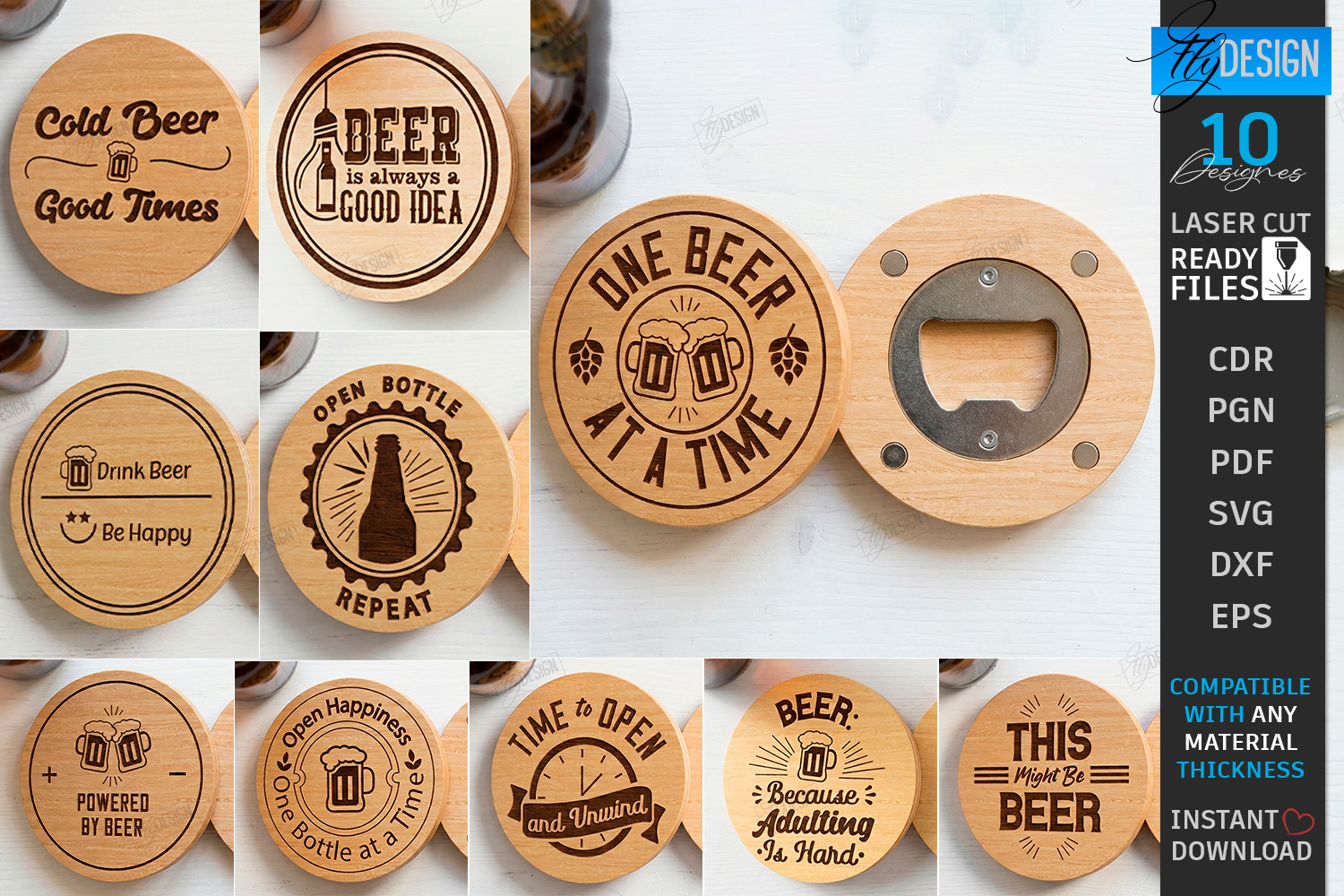 Round Wooden Beer Bottle Opener Laser Cut Bundle | 10 Laser Engraved Designs | Funny Beer Quotes SVG | Groomsmen Gift Idea | Bar Decor Laser Cut Files | One Beer at a Time | Powered by Beer | Man Cave Accessories | Round Beer Coasters | Father's Day Gift SVG | Engraved Coaster Opener | Drink Beer Be Happy | Custom Barware Designs | Glowforge Ready Files | CNC files