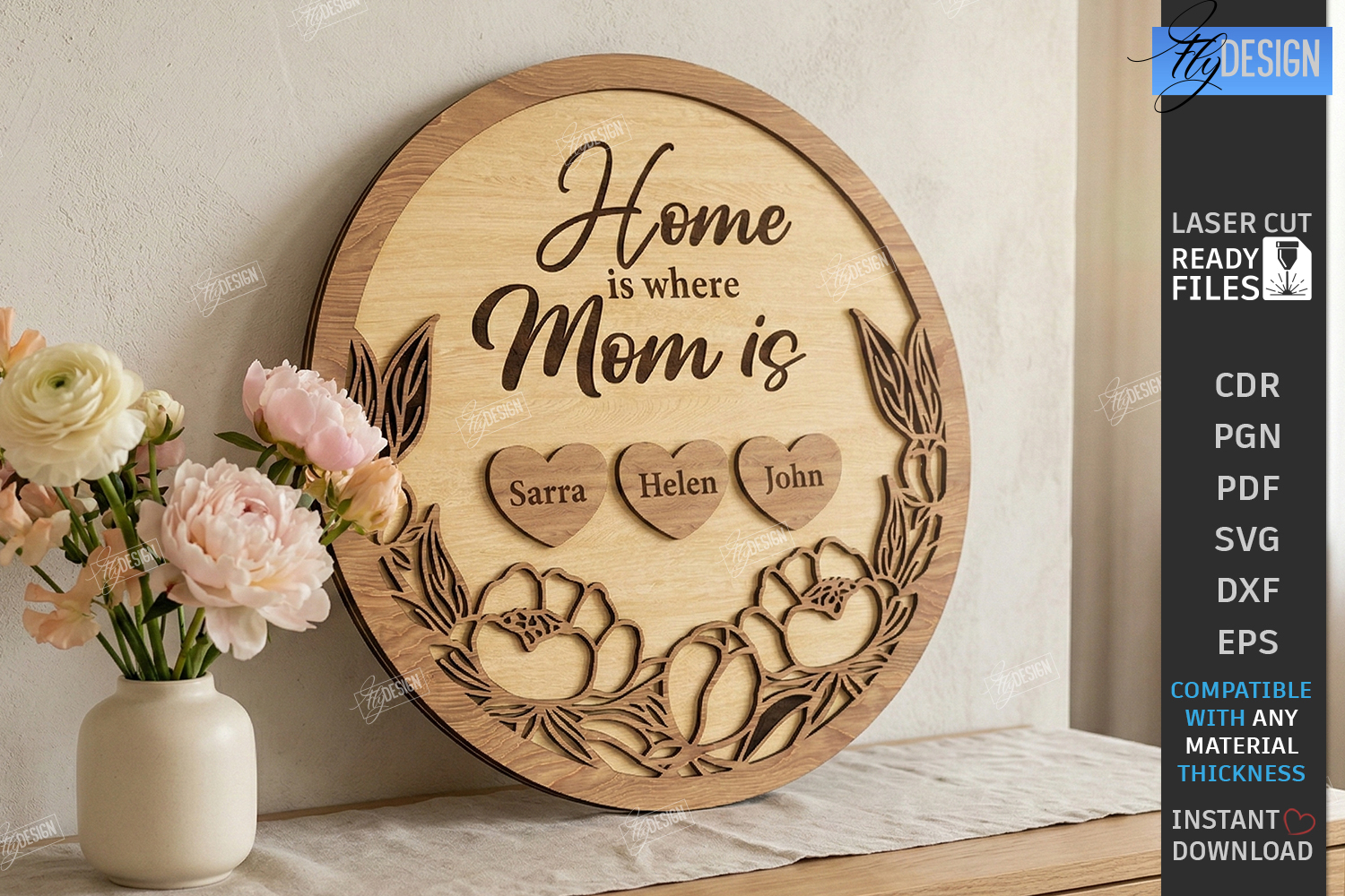 Mother's Day Personalized Wall Sign Laser Cut | Home is Where Mom is Laser Cut File | Custom Family Name Sign SVG | Floral Motherhood Plaque | Mommy & Grandma Heart Decor | Family SVG | Layered Wood Wall Art | Gift idea | Home Decor | Glowforge Ready Designs | Gift for Mom from Kids | Personalized Flower Garden Sign | 3D Mother's Day Keepsake | Digital Download Laser Files | CNC File
