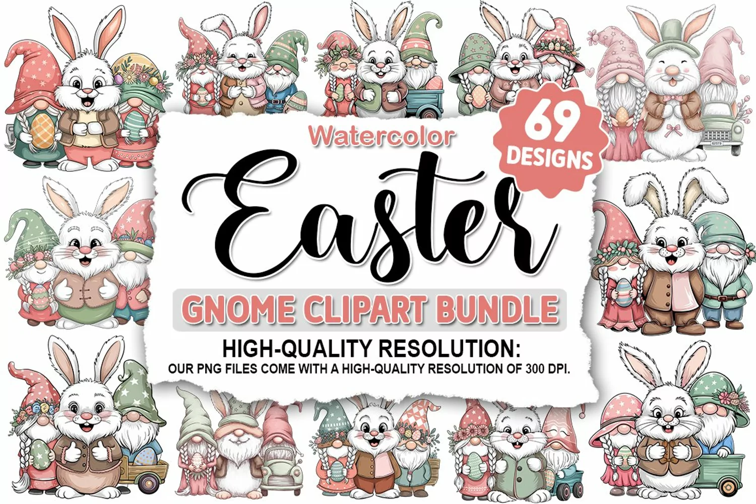 Easter Bunny Gnome Clipart Sublimation Bundle was created by hand and then converted to a digital file.