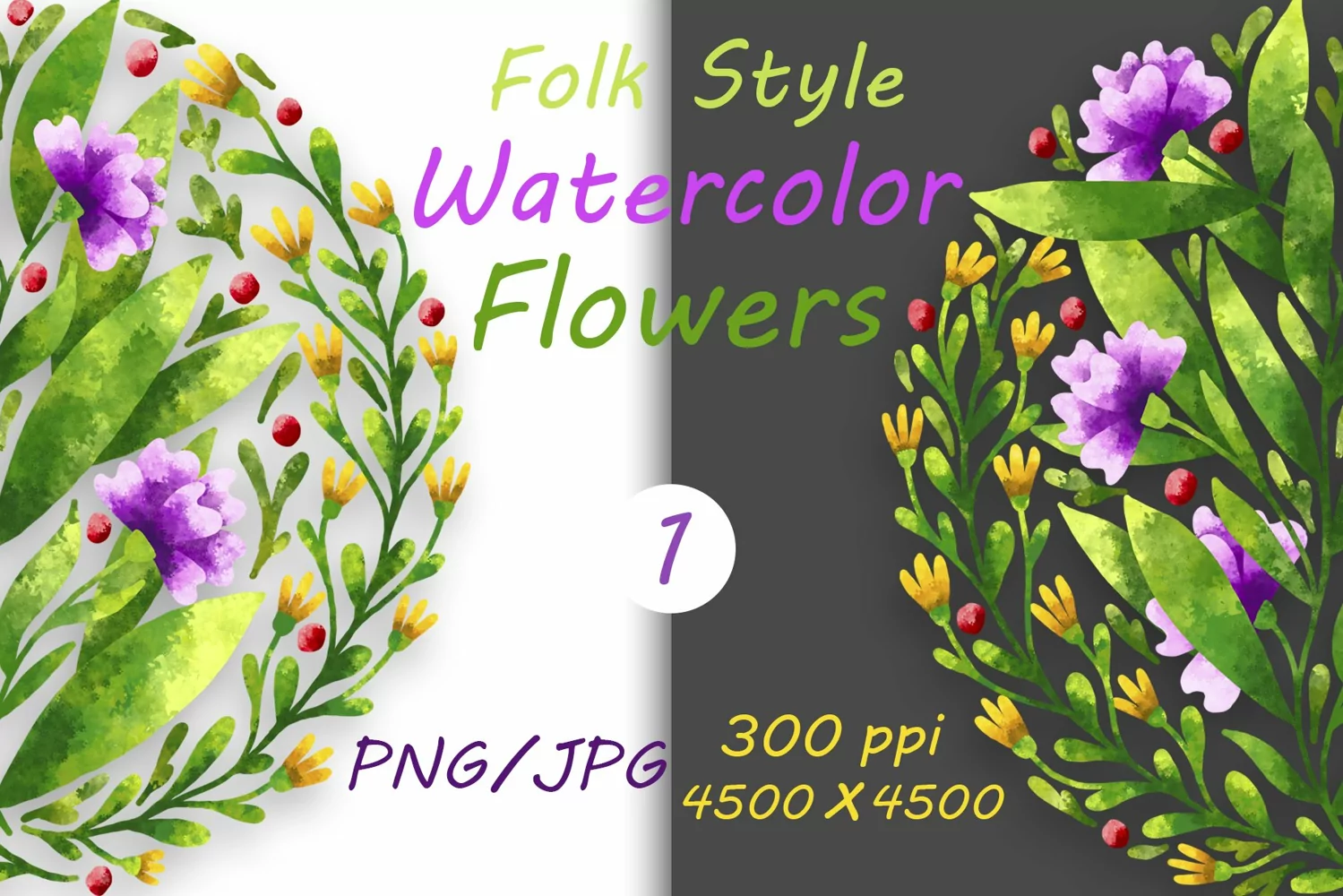 Flowers in folk style drawn with watercolor 1. Watercolor flowers bouquets. Folk floral Clipart. Watercolour high-resolution clip art.