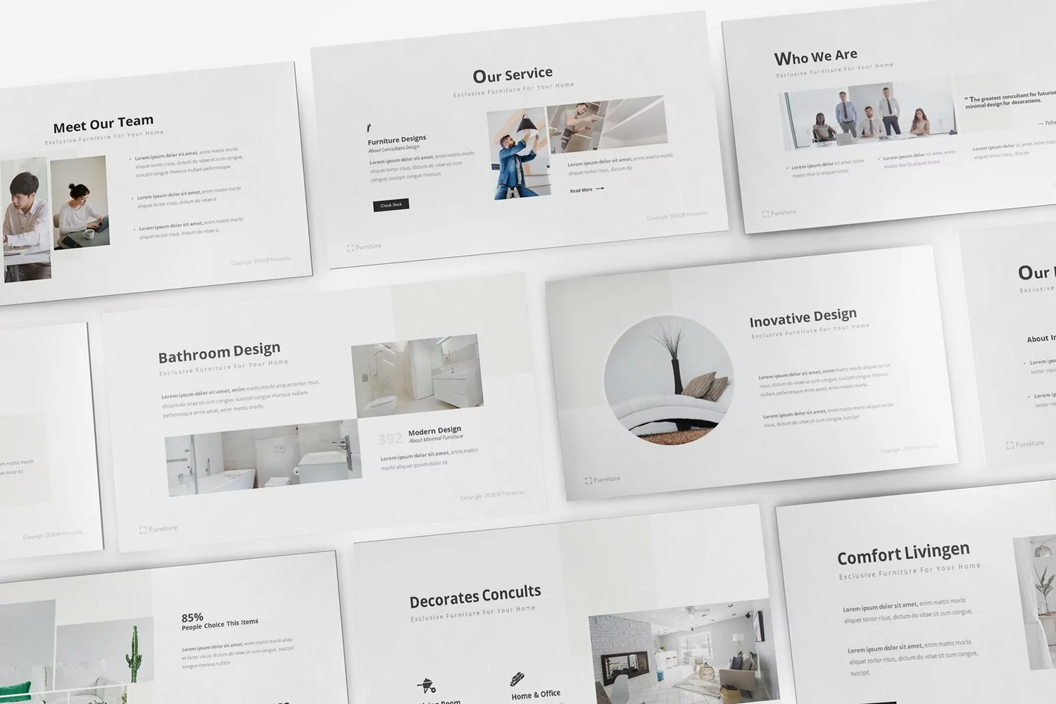 Ravaror Furniture Powerpoint Template for pet presentation template. With flat and minimalist design make your presentation stand out, with simple, clean, and minimalist design concept. for high quality brand presentation asset.