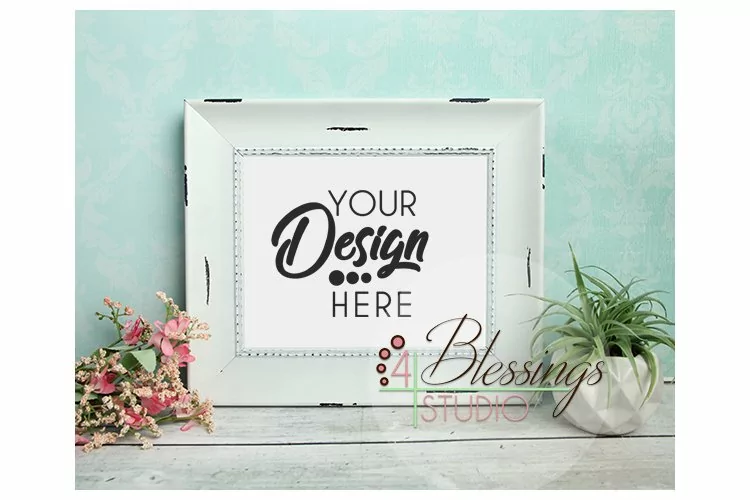 Shabby chic style white frame with 8x10 proportions, horizontal orientation on aqua background with flowers and greenery