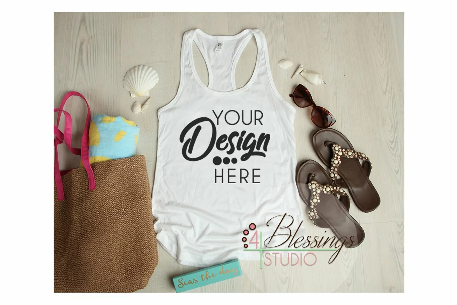 Next Level 1533 White Ladies Rackerback Tank Top Mockup on a shabby chic wood background with Beach items