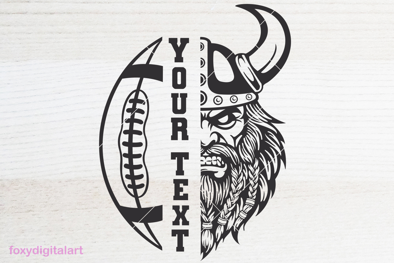 Show off your football passion with this bold and dynamic Viking Football Logo SVG. This digital design features a fierce Viking warrior wearing a horned helmet, seamlessly combined with a stylized American football. The symmetrical, black-and-white illustration creates a powerful visual impact ideal for any sports-themed project.