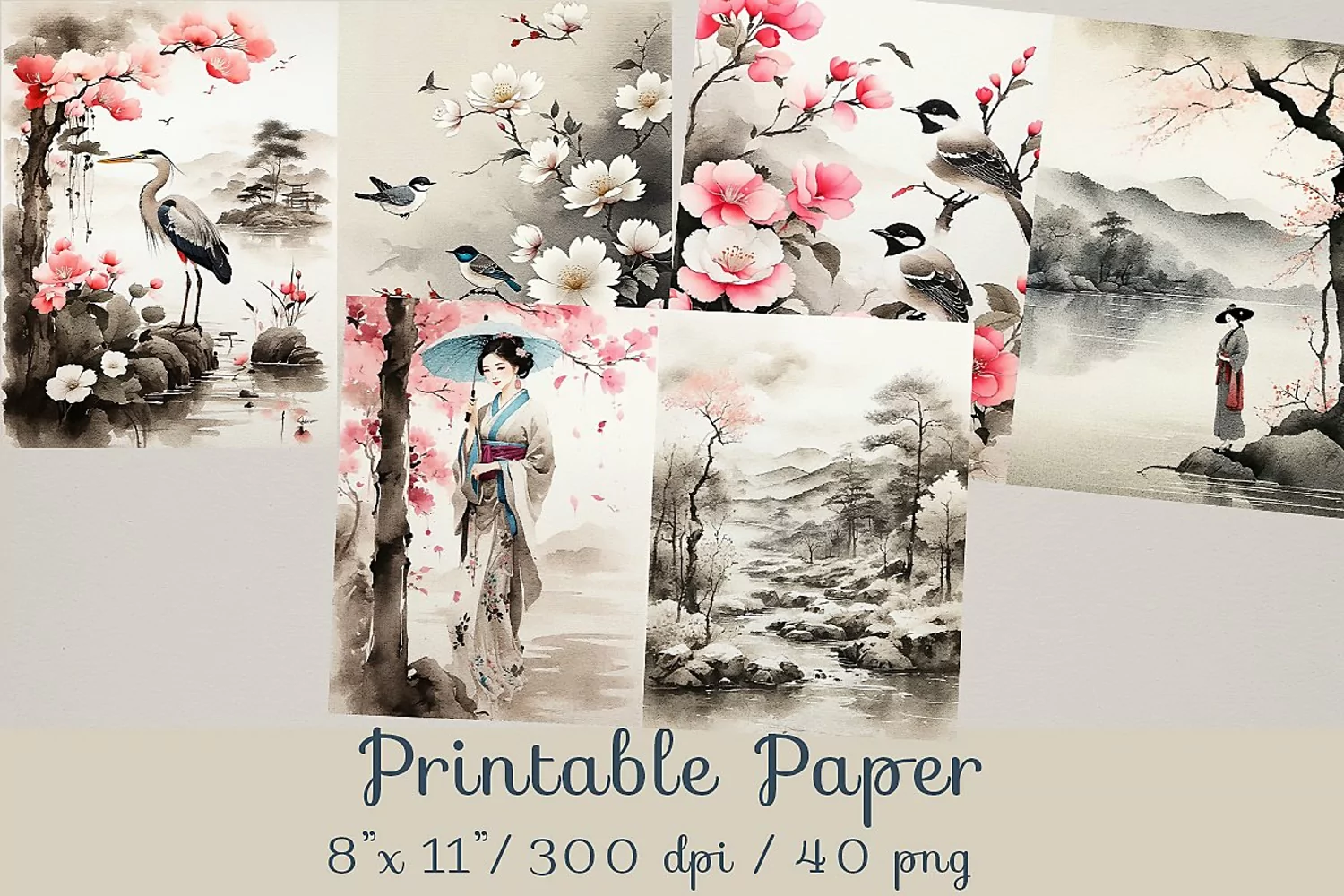 Printable paper, junk journal sheets "Asian landscape, Sacura " - 40 jpg files, 8x11 inches.
