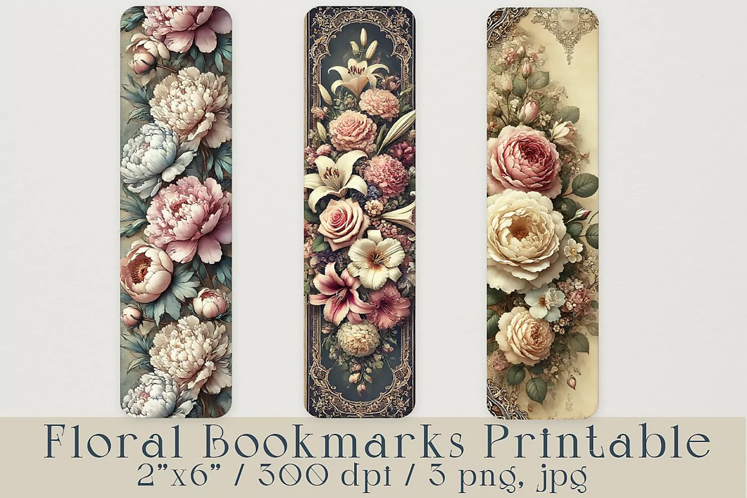 Floral Printable Bookmarks, Victorian era style design -3 png, jpg files.