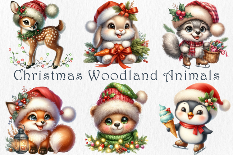 A cozy Christmas woodland clipart bundle featuring adorable winter animals — deer, bunny, fox, and penguin in Santa hats. Perfect for holiday cards, nursery decor, stickers, mugs, invitations, and more. Includes 24 high-resolution PNG files with transparent backgrounds (300 DPI). Use them for sublimation, scrapbooking, print-on-demand projects, or digital crafts to bring warmth and magic to your winter designs.