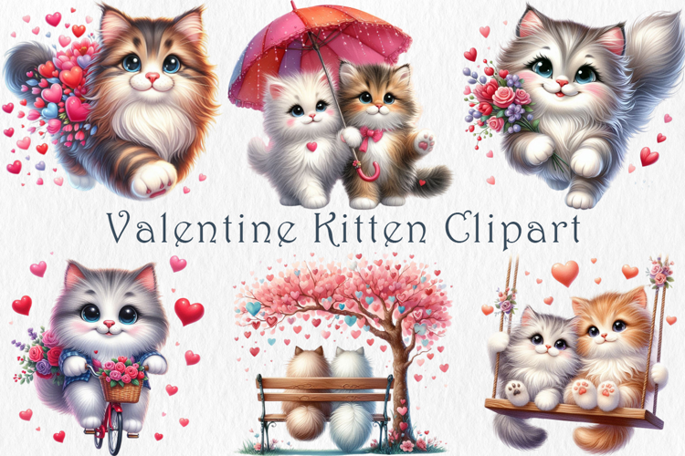 Valentine kitten clipart set with cute romantic cats, hearts, flowers, and love-themed illustrations. Includes 20 high-resolution PNG files with transparent backgrounds. Perfect for Valentine’s Day crafts, kids designs, scrapbooking, junk journals, planners, cards, stickers, and digital projects.