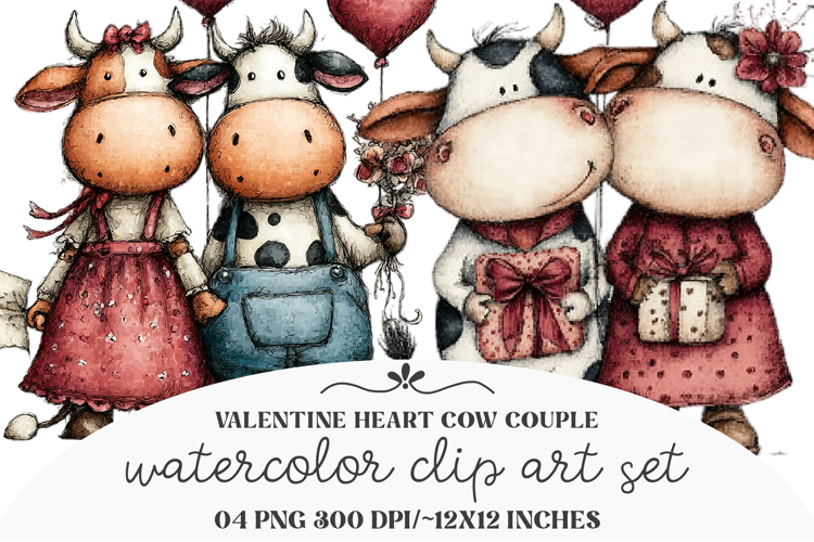 Whimsical Valentine heart Cow Couple Clipart