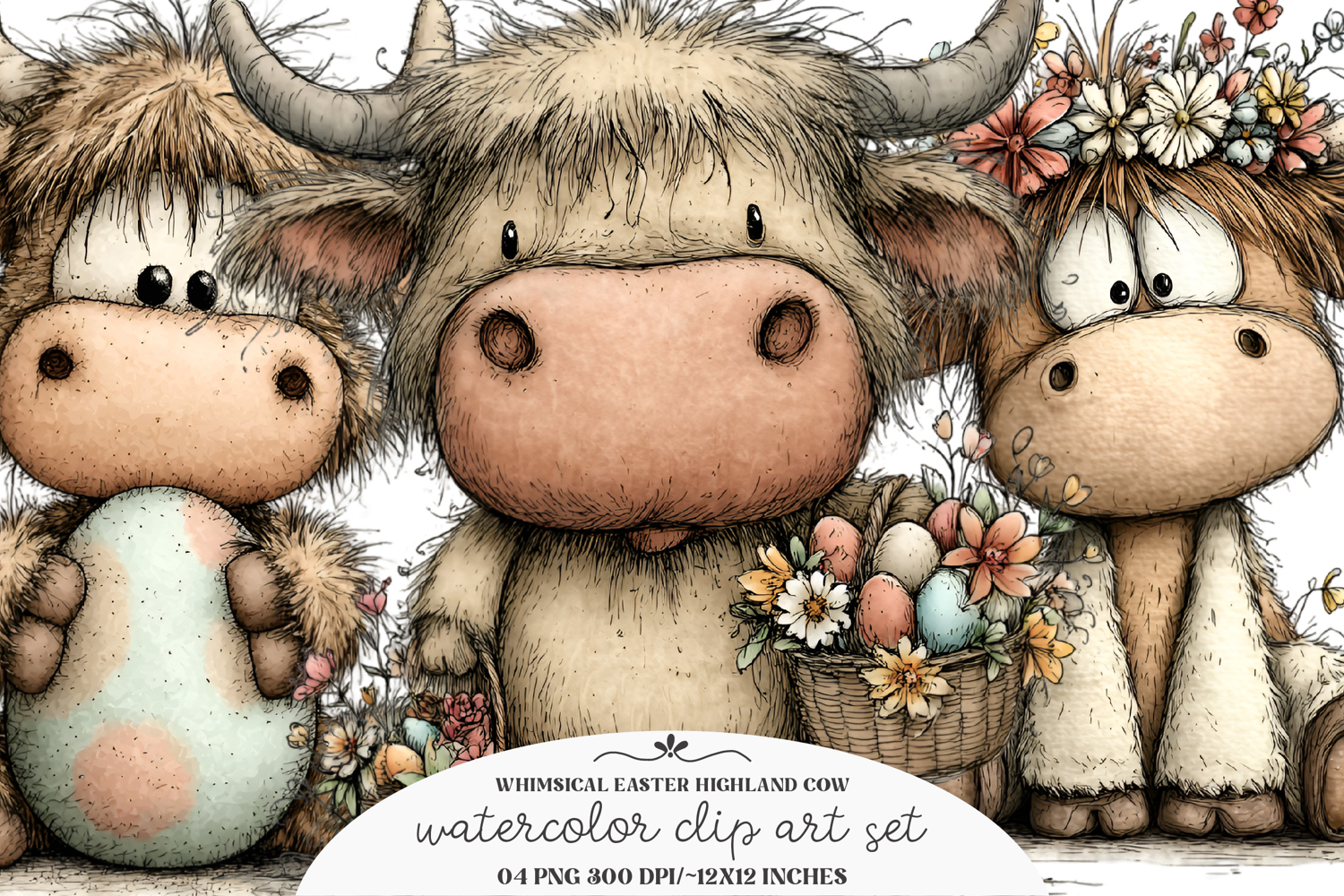 Whimsical easter highland cow clipart - easter highland cow example image 1
