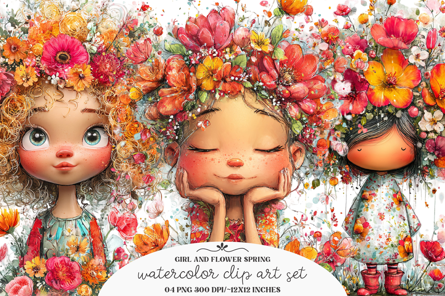 Whimsical girl and flower spring clipart - Flower spring Png example image 1