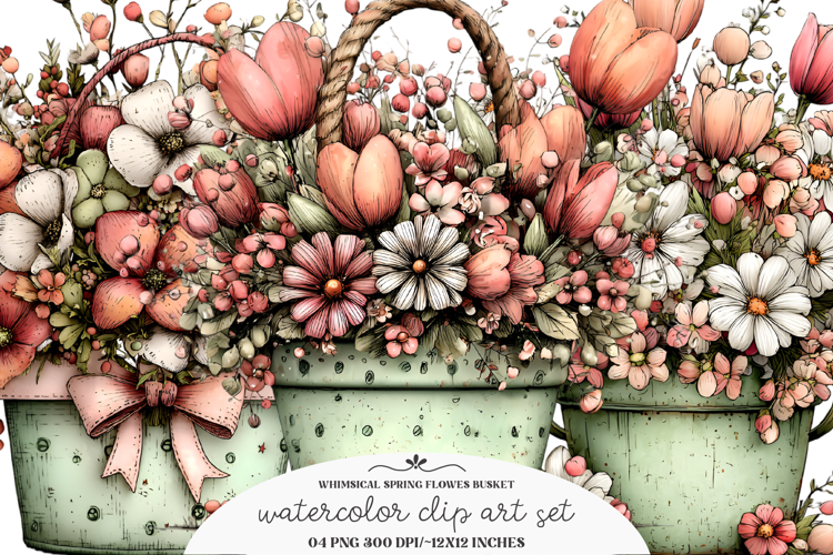 Whimsical Spring Flowes Busket Clipart example image 1