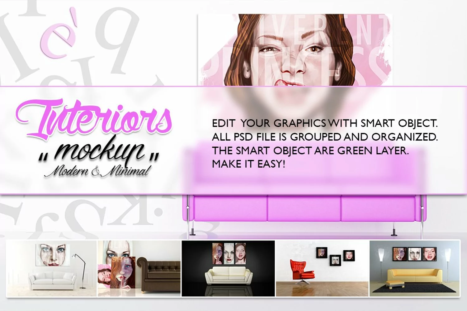 .PDS FILE IS LAYERED AND LABELED Everything in the .PSD files is grouped and organized The Artworks, shine, mirrored and edge are easily modified HELP TO EDIT Any object to Interior set is grouped in a folder labeled, for example “FRAME 1”. Into any folder there is a smart object GREEN colored layer that allows you to insert your own graphics. For editing the mockup files, double click on smart object, and paste your graphics design in smart object and save it.