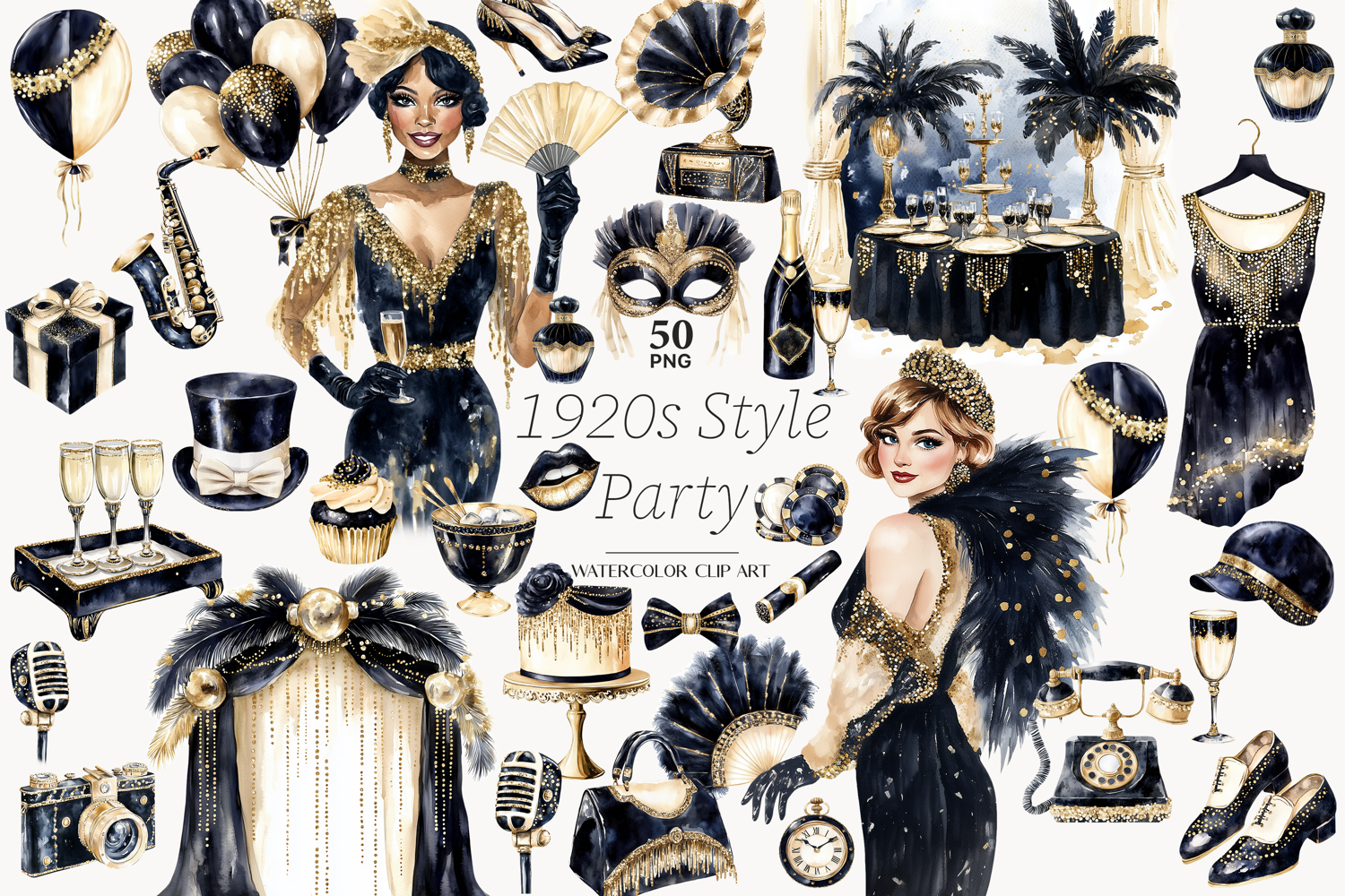 1920s Style Party Clipart - https://designbundles.net/glamartzhanna/6242390-roaring-20s-clipart-gatsby-party-art-deco-png-imag