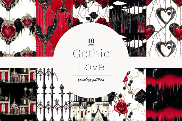 Create mysteriously romantic designs with our captivating Dark Romance Digital Paper Collection! This unique set of 10 seamless patterns features gothic hearts, dark romance motifs, and alternative Valentine's backgrounds perfect for unconventional love projects.