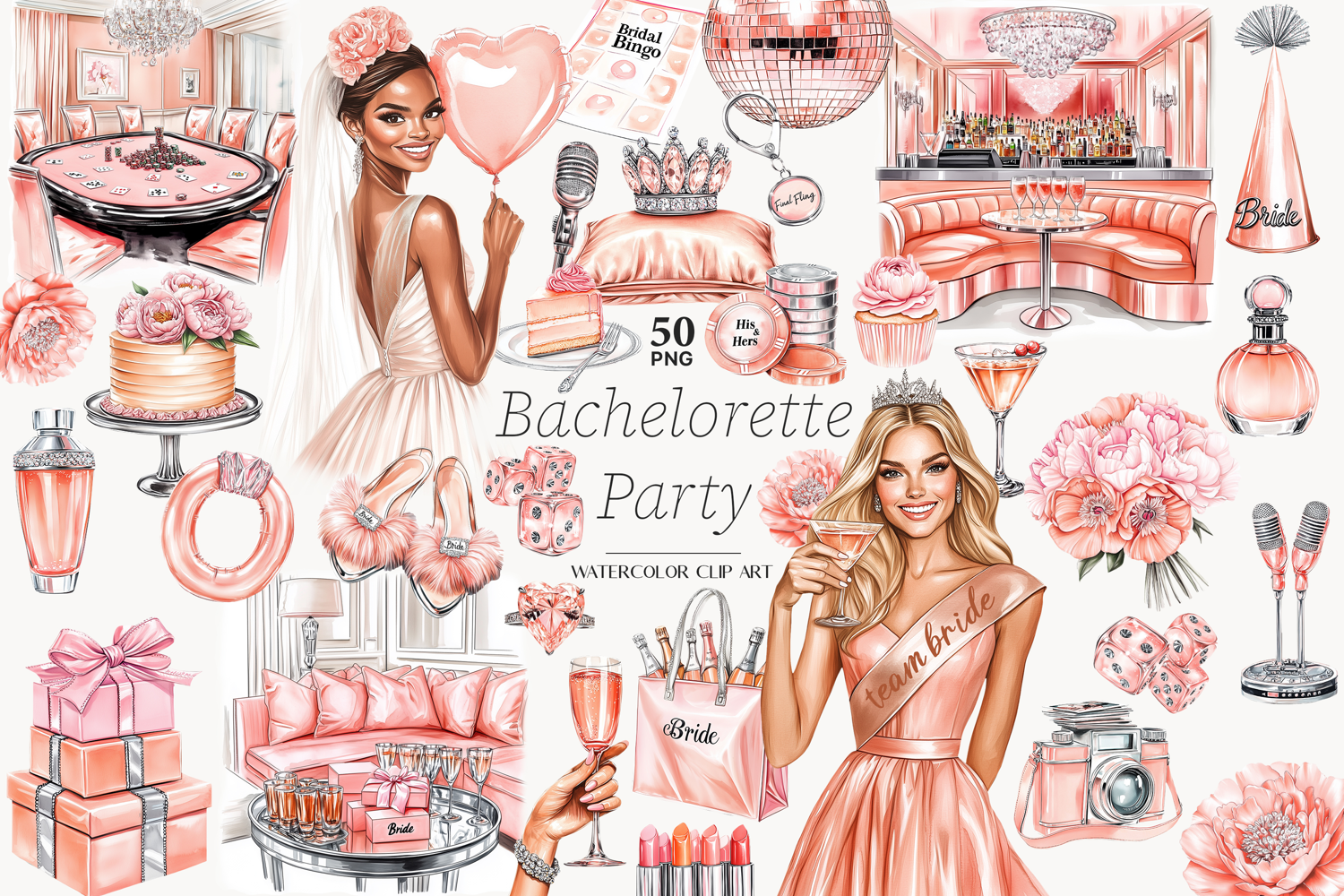 Make every wedding celebration unforgettable with our Bachelorette Party Clipart Collection! This sparkling set of 50 PNGs features everything you need to create stunning bachelorette party decorations, wedding planner spreads, and bridal shower memories.
