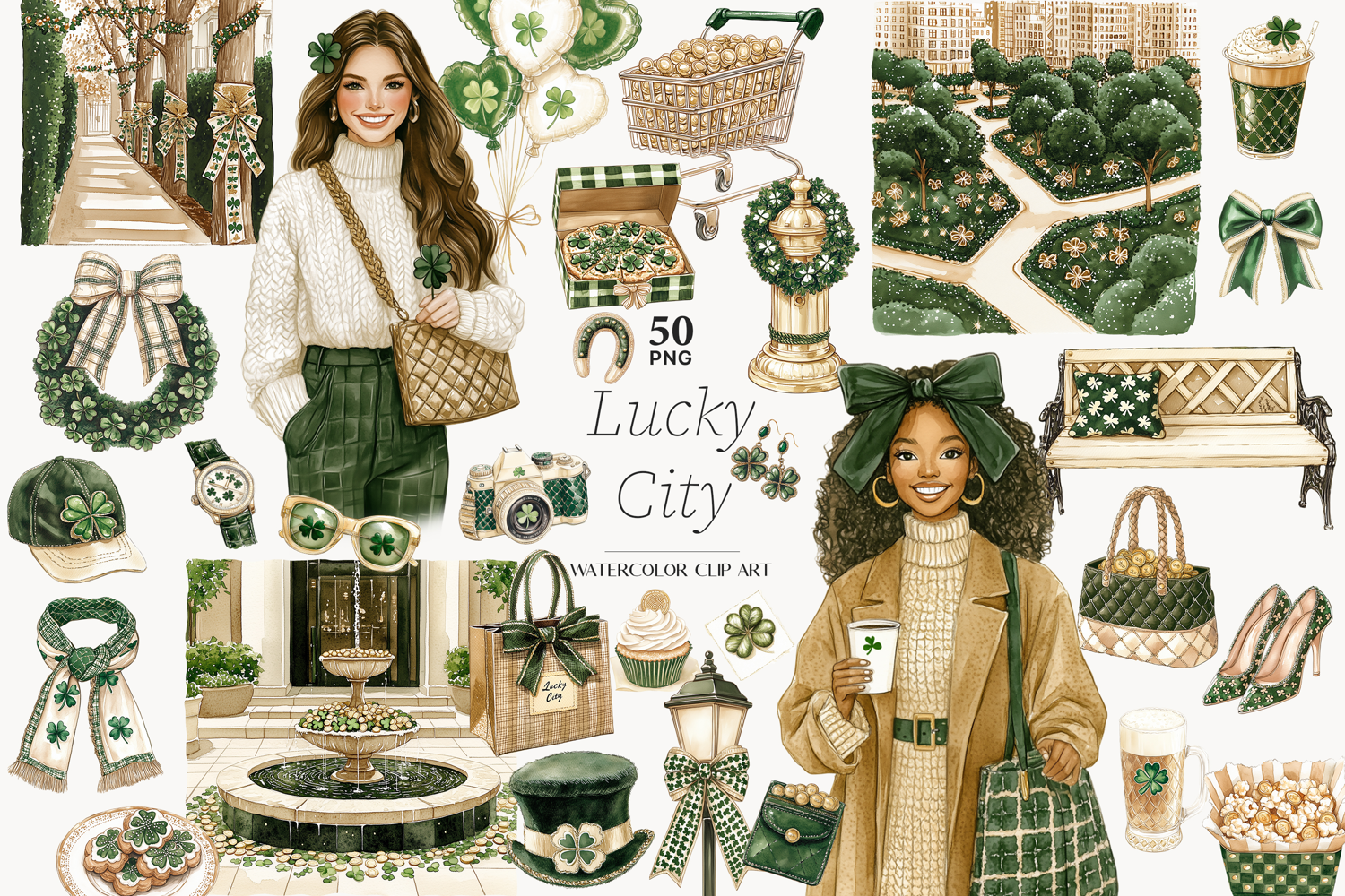 Discover a delightful array of designs featuring stylish Lucky woman PNG and Lucky girl clipart illustrations interacting with charming cityscapes. The collection is rich with classic Irish symbols, including high-quality Shamrock PNG files and detailed Clover clipart, all crafted as seamless Irish Clip Art.