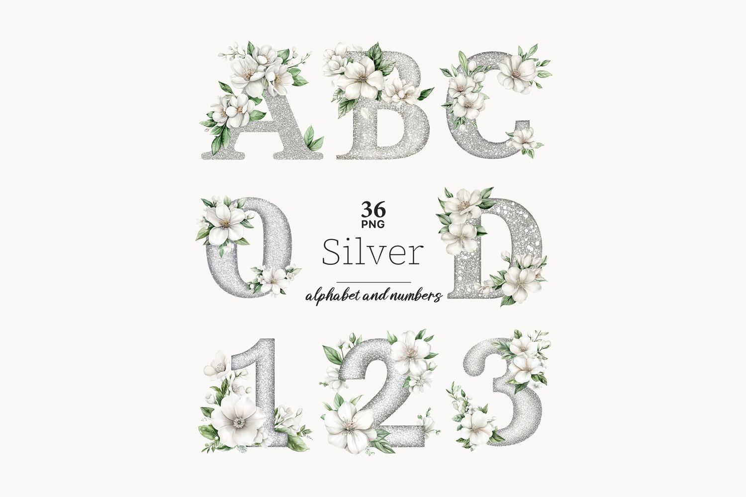 Design breathtaking wedding stationery and elegant invitations with our sophisticated Silver Alphabet Digital Set! This luxurious collection features 36 high-quality PNG files with shimmering silver letters adorned with delicate white flowers, perfect for creating premium event designs.