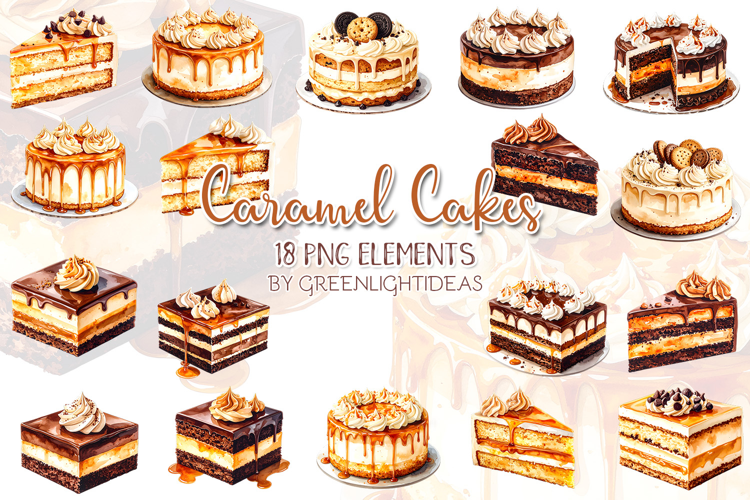 Caramel Cakes Clipart, Watercolor Desserts Graphics