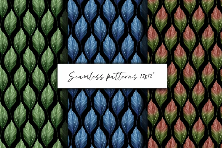 3 JPG files – seamless pattern with leaves on black background (3600 x 3600 pixels)