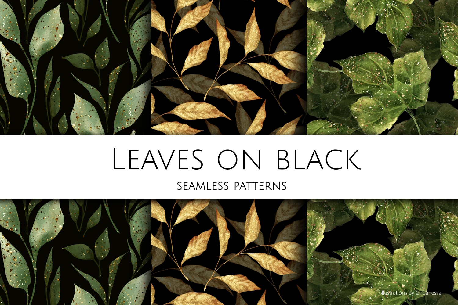 Elegant set of three high-resolution seamless patterns featuring dark, moody aesthetic. The designs showcase green and gold leaves on pure black background. Ideal for luxury home decor, sophisticated apparel, unique packaging, and dramatic digital projects.