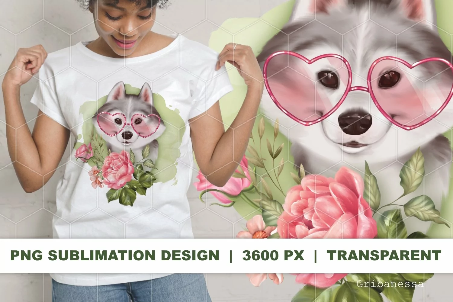A trendy and adorable hand-painted PNG featuring a dog character in stylish pink heart-shaped glasses, surrounded by peony flowers. This high-resolution transparent file is perfect for creating unique t-shirt designs, wall art, personalized gifts, and eye-catching spring sublimation projects.