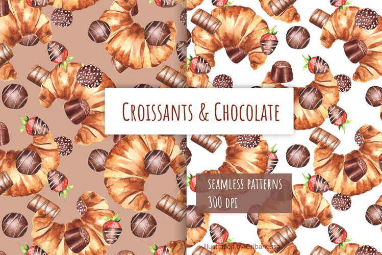 Watercolor Croissants & Chocolate Seamless Pattern Set