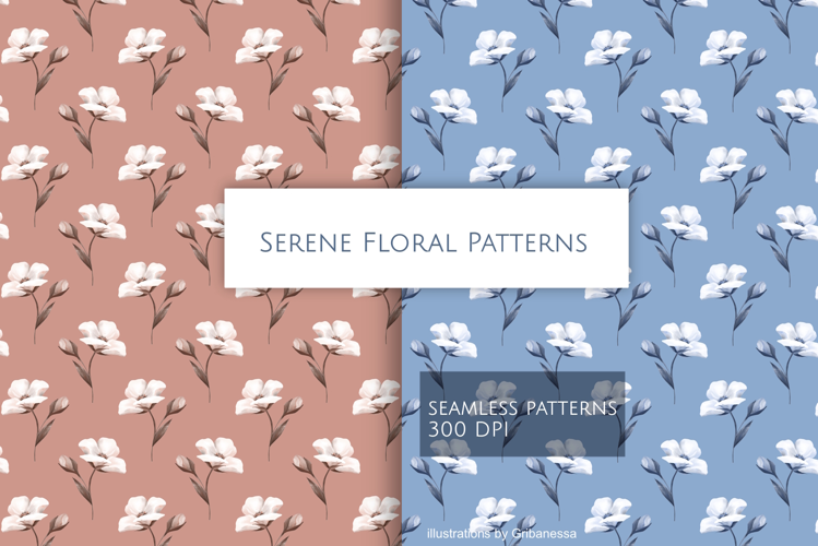 Create something beautiful with this set of two hand drawn seamless floral patterns! Featuring a lovely minimalist design of white flowers on dusty rose and soft blue backgrounds, these high-resolution digital papers are perfect for your DIY projects.