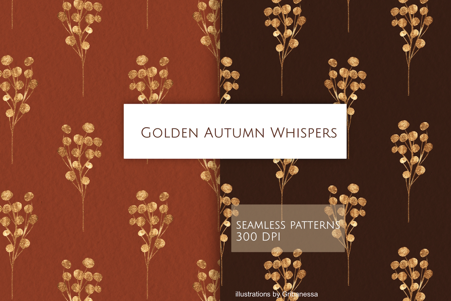 Description: Elevate your creative projects with this elegant set of two seamless patterns featuring shimmering gold glitter floral motifs. The delicate botanical elements are set against rich terracotta and deep chocolate backgrounds, creating a sophisticated and luxurious aesthetic. These high-resolution textures tile perfectly, making them an ideal choice for high-end packaging, textile design, and wedding stationery. Whether you are working on branding, scrapbooking, or custom gift wraps, these golden leaf patterns provide a professional and polished look for any surface design.