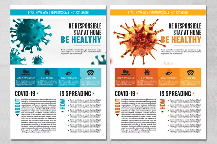 Covid-19 flyer template with blue and orange accents. The template contains 2 pages in A4 format. You will need Adobe Indesign to edit these templates.