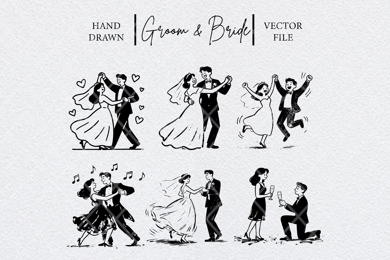 Celebrate love in its purest form with this charming bride and groom doodles illustration bundle. Each illustration is lovingly hand-drawn, capturing the joyful spirit of a wedding day — from first looks to happily ever after.