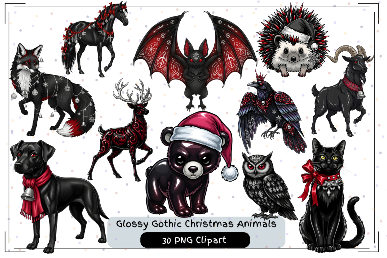 A premium glossy gothic Christmas animals clipart bundle featuring elegant dark holiday designs. Perfect for festive projects with a unique gothic aesthetic.