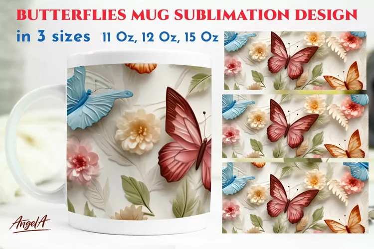3d butterflies ans flowers sublimation mug wrap design is design of plaster texture butterflies and flowers pattern. This mug wrap design is presented in 3 sizes: 11 Oz, 12 Oz, 15 Oz.