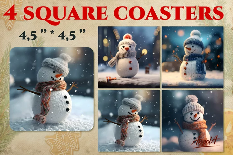 Snowman sublimation square coaster design bundle includes 4 3d snowman Square Coaster sublimations designs with sizes 4,5 inch*4,5 inch created in cartoon style.