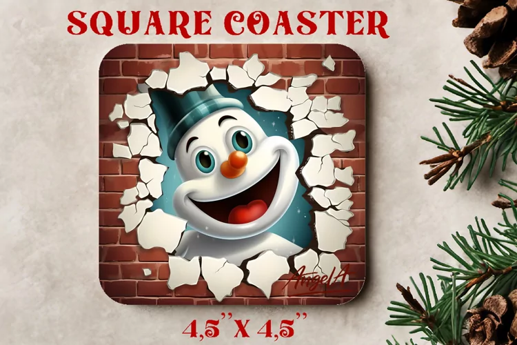 Christmas square coaster sublimation is square design of snowman face illustration in broken brick wall with sizes 4,5 inch*4,5 inch.